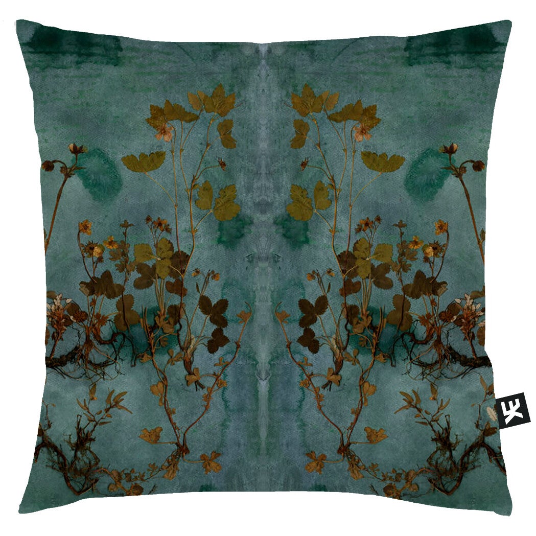 VALENCIE is een geprint sierkussen in een turquoise dessin.