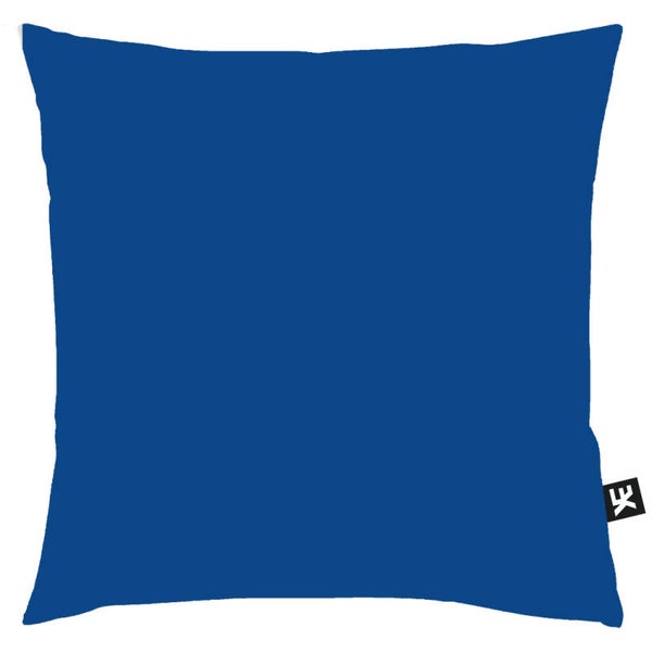 De achterzijde van dit kussen is uitgevoerd in uni kobalt , rondom afgewerkt met een lichtblauwe paspel.