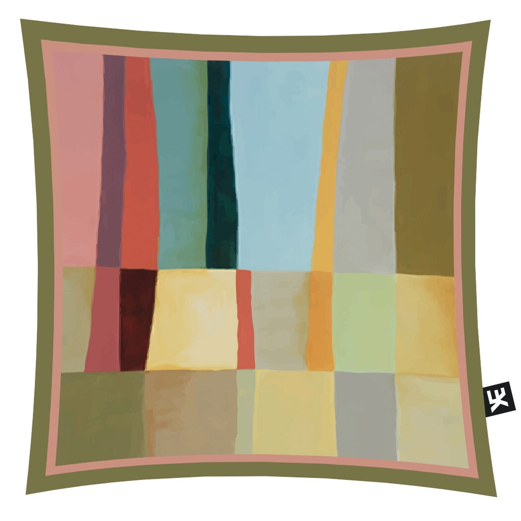 DORNO is een geprint kussen in multicolor kleuren met een onderscheidende voor-en achterkant.