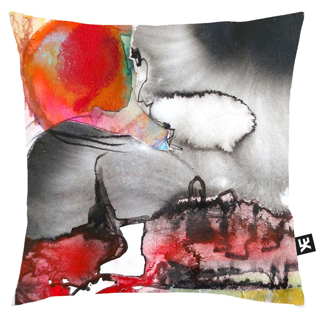 De achterzijde van het kussen is uitgevoerd in een uni kleur , passend bij het kunstwerk