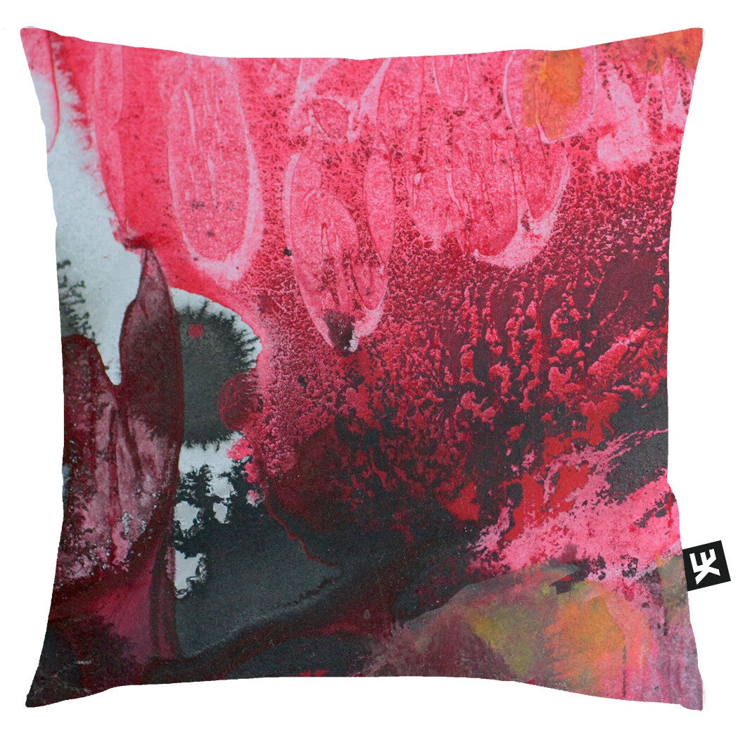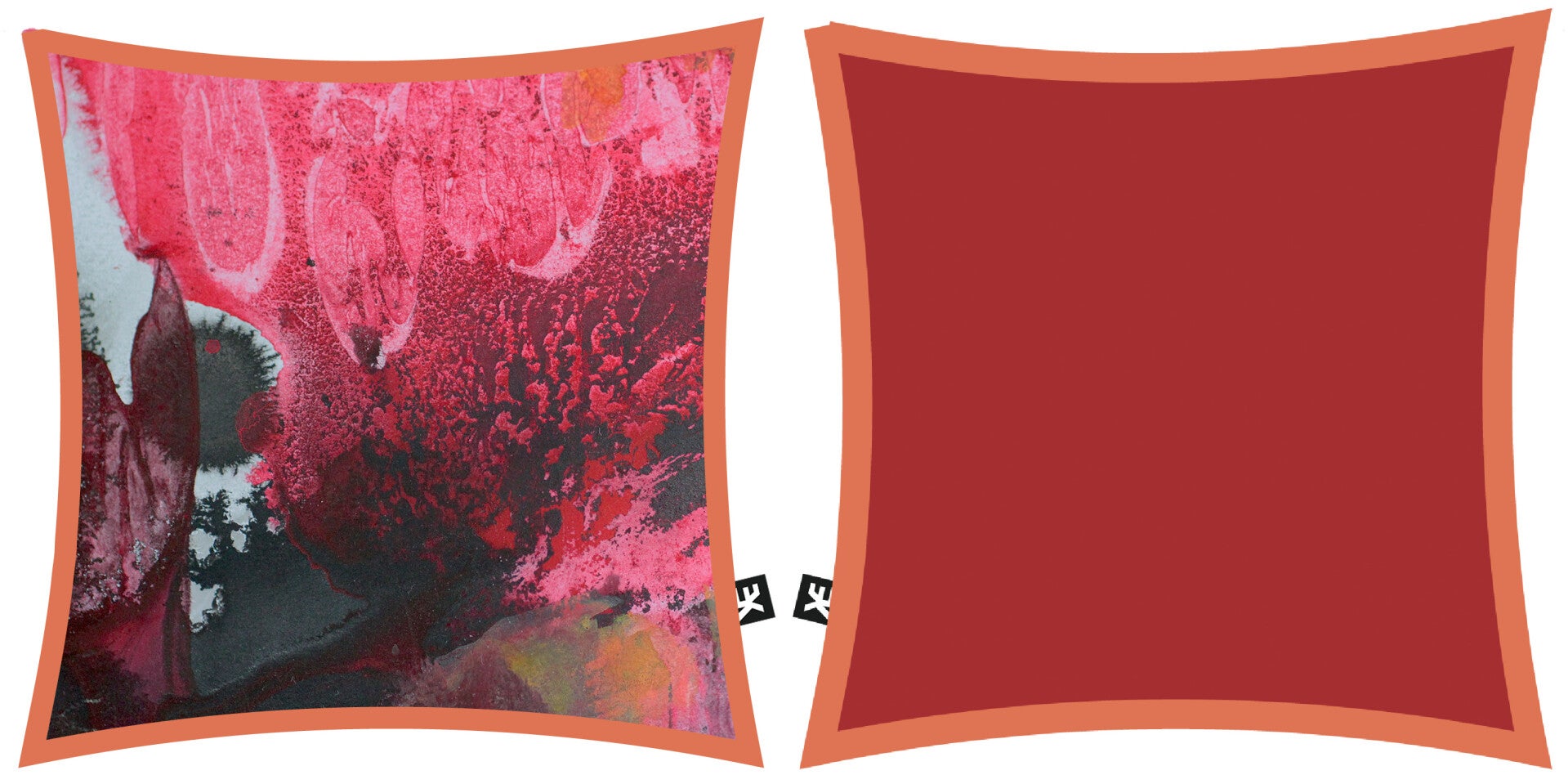 De achterzijde van het kussen is uitgevoerd in een uni kleur , passend bij het kunstwerk