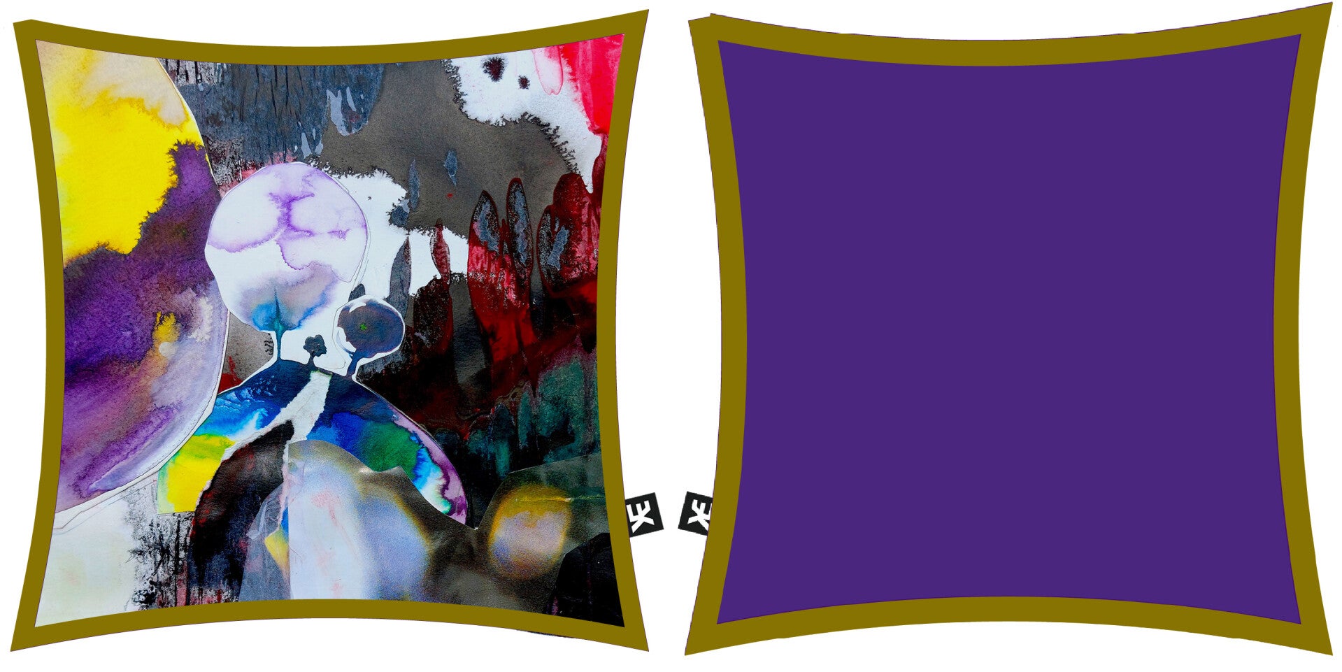 De achterzijde van het kussen is uitgevoerd in een uni kleur , passend bij het kunstwerk